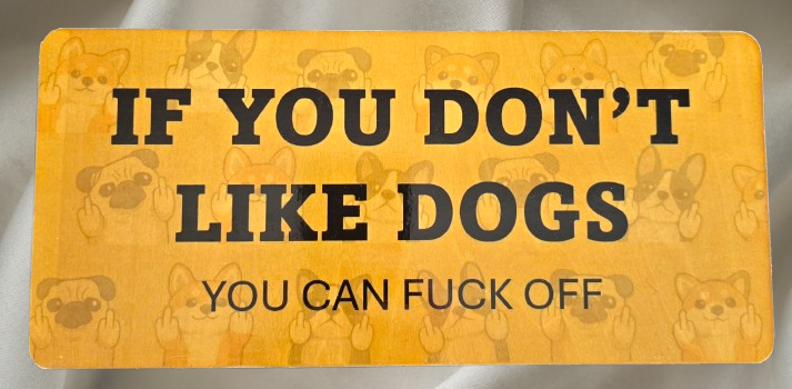 Humoristinen asennekyltti. Kyltti pinnoitettua vaneria ja leveys n. 28cm. Saat taustalle halutessasi oman lemmikin heiluttamaan sormea. Vaihdamme tekstin, halutun kohteen mukaan. (Dogs, Cats jne.) Laita kuva ja tietosi ennen tilausta osoitteeseen asiakaspalvelu@lahjaset.fi, niin lähetämme luonnoksen hyväksyttäväksi. Kun maksat tilauksen, niin aloitamme valmistuksen.