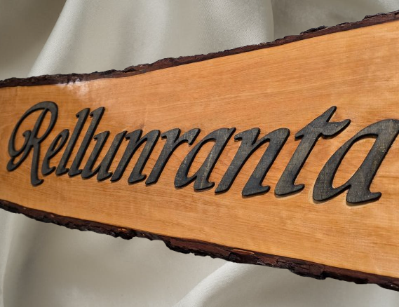 Tuppeensahattu tervaleppä kyltti. Kokonaispituus vaihtelee keskimäärin n.40-100cm välillä. Tekstin ja reunan väliin jätetään n.5-10cm tyhjää tilaa. Kylttien hinta normaalisti noin 50-100€ välillä.